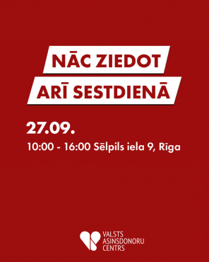 Sestdien, 27. septembrī, no plkst. 10:00 līdz 16:00, donori tiks gaidīti Sēlpils ielā 9
