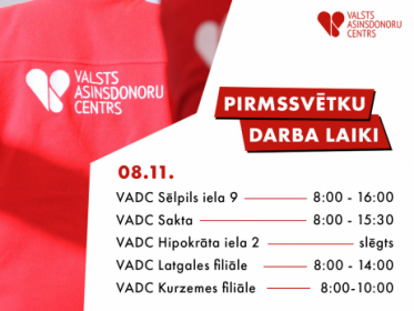 Lūdzam iepazīties ar darba laikiem 8. novembrī. 17. un 18. novembrī ziedošanas vietas būs slēgtas – atzīmēsim Valsts svētkus. Gaidīsim donoros atkal 19. novembrī!